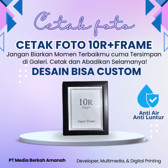Cetak foto ukuran 10R lengkap dengan frame stylish. Hasil cetak jernih, warna tajam, dan siap dipajang untuk mempercantik ruangan atau jadi hadiah spesial.
