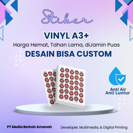 Cetak stiker Vinyl ukuran A3+ dengan bahan lentur, tahan air, dan hasil cetak full color berkualitas tinggi. Cocok untuk pemakaian indoor maupun outdoor.